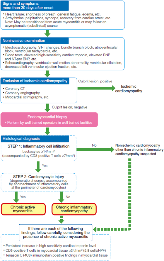 症状・徴候から心筋炎が疑われ,発症から30日以上の経過で,非侵襲的検査(心電図,血液検査,心エコー図)で心筋炎を支持する所見を認める場合,虚血性心疾患を除外し,心内膜心筋生検で炎症細胞浸潤かつ心筋細胞傷害の所見が認められれば慢性活動性心筋炎と診断する.炎症細胞浸潤を認めるものの,心筋細胞傷害所見がない場合は慢性炎症性心筋症と診断する.慢性活動性心筋炎および慢性炎症性心筋症の診断アルゴリズムに心臓MRIでの評価は登場しない.