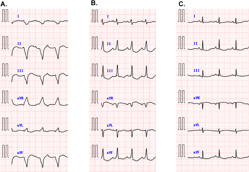 A) Presented with complete atrioventricular block before steroid pulse therapy. B) Twenty-four hours after the first 30 mg/kg dose of methylprednisolone (just before the second dose), 1 : 1 atrioventricular conduction was restored. C) After another 24 hours (just before the third dose), the wide QRS returned to narrow.