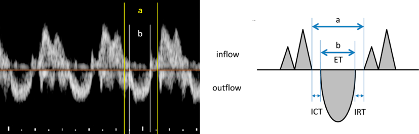 心周期における房室弁閉鎖から半月弁開放までの等容収縮時間(Isovolumetric Contraction Time; ICT),半月弁閉鎖から房室弁開放までの等容弛緩時間(Isovolumetric Relaxation Time; IRT)はそれぞれ収縮障害,拡張障害により延長する.MPIは心室流入終了から開始までの時間(a)と心室駆出時間(b)より,MPI=(a−b)/bとして算出されるが,これは(ICT+IRT)/bと同義である(Fig. 6).このため心室の収縮機能・拡張機能いずれの低下でもMPIは増大し,心室収縮機能と拡張機能の統合指標とされる.胎児での正常値はこれまでにさまざまな報告がされているが,Ghawiらの報告によると左室0.464±0.08,右室0.466±0.09とされている11).週数による変化は報告によって異なり一定の見解はない12).