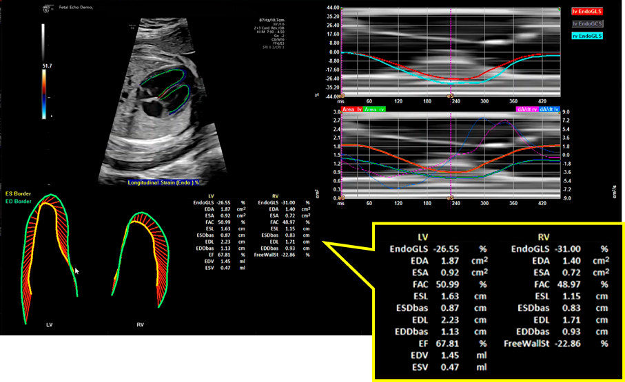 ストレインは四腔断面像もしくは短軸像の画像を記録し,それをオフラインで解析して計測する.ストレイン解析を行う際には,記録した画像の画質が良好であることに加えて,胎児心拍数は140 bpm前後と速いために画像のフレームレートが十分に高いことが重要で,フレームレートが低いとストレイン値が不正確になる可能性がある.本来は心電図を基に1心周期を判定して計測されるが,胎児では心室壁の動きから1心周期を設定して解析が行われる.現在複数のメーカーの心エコー装置で胎児のストレイン計測が可能である(Fig. 7).ただし心エコー装置・解析ソフトウェアによって解析アルゴリズムが異なるため算出されるストレイン値も異なることに注意が必要である18).これまでに各メーカーの装置により計測された胎児心室のストレイン値が多数報告されているが,値や在胎週数による変化は報告により一定しない.本邦からも多施設共同研究による多数例の日本人正常胎児のストレイン値が報告されており,左室,右室のGlobal Longitudinal Strain; GLS(心室全体の長軸方向ストレイン)はそれぞれ−24.3±3.5%,−23.5±3.7%で,在胎週数が進むにつれて増加(絶対値は低下)するとされている19).