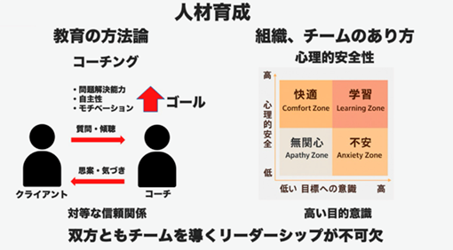 こうした課題に対応するためには,人材育成方法自体のシフトチェンジが必要であり,それを実行に移すには,現場の価値観を変革し,組織を方向づける強いリーダーシップが不可欠である.単なる指示命令ではなく,理念を共有し,ビジョンを示し続けるリーダーの存在が,持続的な改革を推進する鍵となる.当院でもこの課題に対し,「心理的安全性」と「コーチング」を人材育成の中核に据え,循環器小児科部長,心臓血管外科部長 共同で取り組みを行っている(Fig. 1).