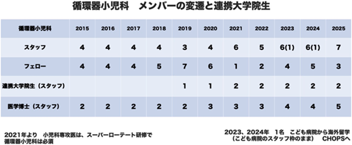 当院ICUはセミクローズド型のICUとなっており,小児先天性心疾患術後患者は主に心臓血管外科医と小児科循環器医がオンコール制をとって術後管理を行ってきた.その管理にICUドクターからサポートも受けていたが,2019年度よりICU内の小児科スタッフ(小児集中治療室(PICU)ドクター)をICUスタッフとして配置した.このことによりPICUドクターが勤務する時間帯には先天性心疾患患者の診療と処置をシェアすることが可能となり,我々の業務量は減ることとなった.さらに,2022年度にはPICUドクターを2名に,2023年度からは4名に増員することで,ICUにおけるワークシェアが進み,さらに我々の業務量が減ることとなった.