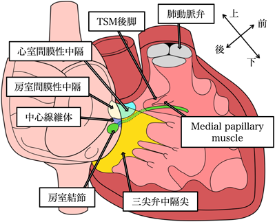 Medial papillary muscleは三尖弁の前尖・中隔尖交連部を支える乳頭筋であり,通常TSM後脚に位置する.