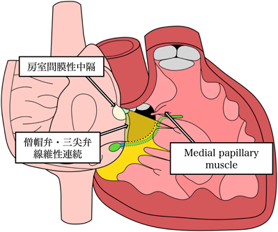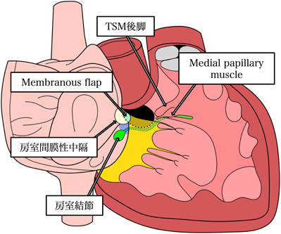 Outlet perimembranousではmedial papillary muscleが後下縁に付着し,右脚走行の指標になることがある.YoshitakeらのVSD剖検心8例をSP-ring8を用いて解析した報告では,伝導路は欠損孔下縁に沿って走行し,medial papillary muscleの下を通って右室側へと続き,右脚はTSM前脚と後脚のlimbの間を走行していた5).Yoneyamaらは,伝導路はTSM後脚に覆われ左室方向に偏位するが,medial papillary muscle基部で右脚が右室心内膜下に現れる,と報告している6).また当院の山岸は,右脚はTSMのやや右寄り(2 : 1程度)の部位を走行する,と述べている3).