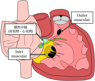 Trabecular muscular defectsはmuscleの境界のみを有し,心室中隔の肉柱部に位置する.Inlet muscularおよびoutlet muscularはそれぞれinlet defectsおよびoutlet defectsに分類されることに注意しなければいけない.