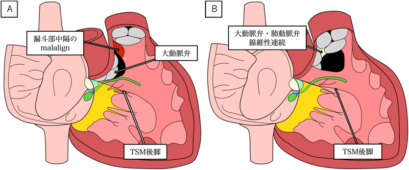 Outlet perimembranous defectsは通常,漏斗部中隔のmalalignを伴う.Central defectsおよびinlet perimembranous defectsと同様に,三尖弁と大動脈弁の間の線維性連続を認める.Central perimembranous defectsでは三尖弁中隔尖に隣接するが,outlet perimembranous defectsは三尖弁前尖に隣接する.伝導路は欠損部の後下縁に沿っているため外科的閉鎖の際には運針に注意が必要である(Fig. 5(A))が,central perimembranousやinlet perimembranousと比較すると,後下縁はTSM後脚なので伝導路は厚いmuscleに覆われる.