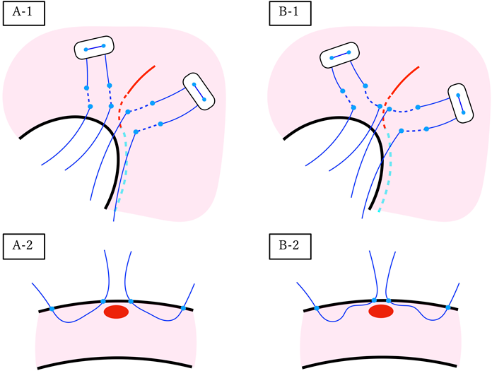 A-1, A-2:右脚が心内膜下を走行する部位に直接運針を行わず,1.5から2 mm程度間隔を空けて運針する方法. B-1, B-2:右脚のやや手前で心内膜下まで刺出し,心内膜下をすべらせるようにしてから想定ラインの1 mm手前に刺出する方法. 水色点線:分岐束,赤点線:Bifurcating bandle,赤線:右脚