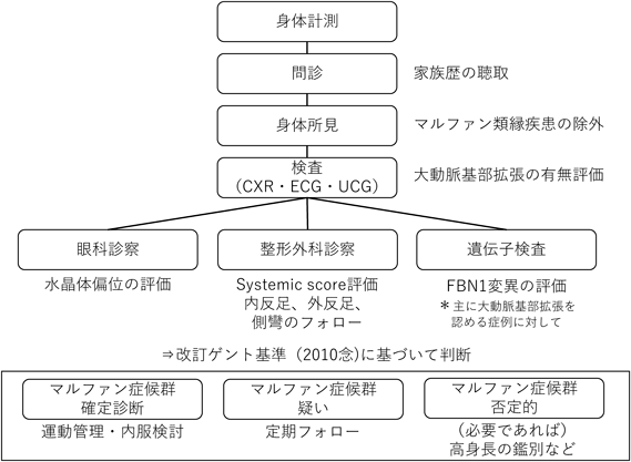 Marfan症候群は幅広い表現型を持つ全身性の結合組織疾患であり,遺伝科・循環器科・眼科・整形外科・胸部外科・産科の専門科チームと連携しながら,生涯にわたってフォローをする必要がある.Marfan症候群の診断は,家族歴の聴取・大動脈基部拡張の評価(小児科・循環器科)・水晶体偏位の評価(眼科)・骨格の基準の評価(整形外科)・遺伝学的検査(遺伝科)など2010年に発表された改訂ゲント基準に基づいて行う(Fig. 1)2).2010年の改訂ゲント基準は,それまでの診断基準と比べて,大動脈拡張と水晶体偏位を重視し簡便化したことと,FBN1変異の位置づけを明確化したことに特徴がある.Marfan症候群が疑われる患者に対する検査・診断の流れをFig. 2に示す.近年は,HTADに対する遺伝子解析を保険診療で行うことが可能になっており,かずさ遺伝子検査室などで関連遺伝子群の受託検査を行っている.