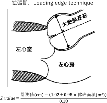 Marfan症候群の診断および治療方針の決定には,心臓超音波を用いた大動脈基部拡張の評価が重要である.Valsalva洞径のZ value≥2を大動脈基部拡張ありと判断するが,改訂ゲント基準においては,Z value≥3が家族歴のある小児における基準になっていることに注意する.小児においては,成長に伴い大動脈基部径の絶対値が増加することが想定されるため,経時的変化はZ valueで比較する.小児においては様々なValsalva洞径のZ valueの計測方法・計算式がある.改訂ゲント基準でも,米国マルファン財団のホームページに記載されている収縮期のInner-edge法やRomanらの報告にある拡張期のLeading edge法の両方が記載されているが,当院では後者を用いている(Fig. 4)7).診断だけでなく治療適応を検討する際にも,Romanらと同様の方法で大動脈基部径を計測するのが一般的だが,この方法は験者間のばらつきが比較的大きい方法であるため,特に経時的変化を評価する際には注意が必要である.Fig. 5に示すように,多くのMarfan症候群の患者において,大動脈基部の短軸像は円形というより三角形に近い形状をしている.そのため筆者は,短軸像で三角形の高さにあたる部分の距離を計測した後に,その短軸で計測した方向の断面を長軸で描出し,大動脈基部径の計測を行っている.正しい断面の描出ができている場合は,短軸と長軸の計測径は一致し,再現性高く大動脈基部の径を評価することができる.Romanらの報告のように,心室の長軸にあわせて大動脈基部を描出した場合,Fig. 4のシェーマにあるようにValsalva洞は胸壁側も背側も膨らんで見えるが,Fig. 5の方法では背側のValsalva洞はほぼ直線状に描出される.小児のMarfan症候群で,経時的変化を評価する際は,再現性の高いFig. 5の方法が有用である.小児期に大動脈弁閉鎖不全を認めることはまれであるが,特に基部拡張が進行した例では注意する.最終的に手術適応を評価する際は,造影CTで動脈瘤の大きさの評価を行うが,その際は動脈瘤の最大短径の計測を行う8).