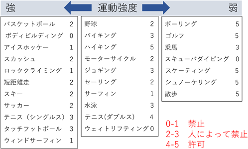 小児Marfan症候群における運動制限の考え方については,2004年のアメリカ心臓病学会からの身体活動に関する提言10)が参考になる(Fig. 6).この提言ではスポーツの種類ごとに推奨レベルが記載されているが,実際にこの通りに細かく指導を行うことは外来診療では難しい.当院では,大動脈基部拡張のある患者,解離の家族歴のあるMarfan症候群の患者では,①ウェイトリフティングなどのアイソメトリックエキササイズ,②高度のエアロビックエキササイズ,③身体衝突の可能性のあるスポーツ,については避けるように指導を行っている.学校生活管理指導表の区分としては,大動脈基部径などにより患者ごとに調整・相談が必要だが,当院ではMarfan症候群と診断されている場合は小学校高学年からD管理かつコンタクトスポーツ禁止としていることが多い.