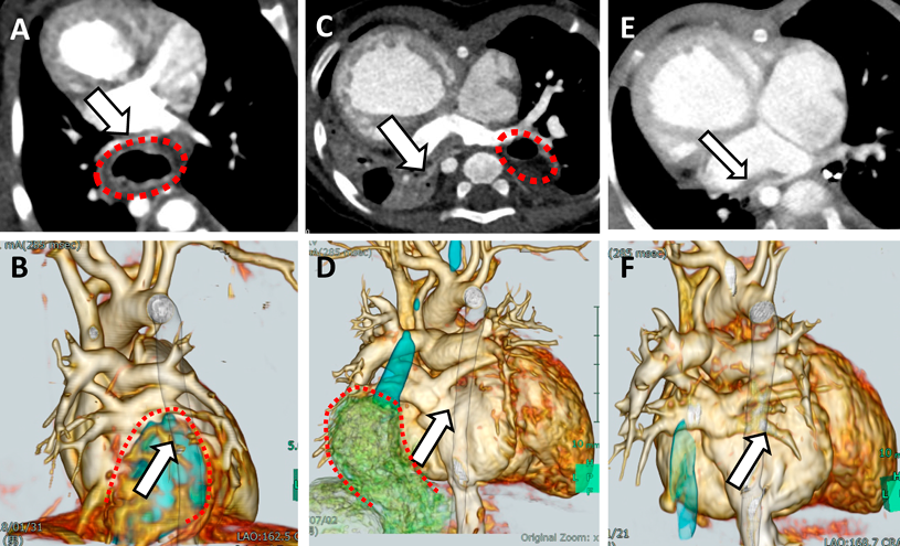 HH手術施行6例中肺静脈圧排が疑われHH手術を行った4例は,いずれも胸部CT検査で滑脱した胃による肺静脈圧排解除が確認された.そのうちの1例(症例4)の画像を提示する(Fig. 1).出生時の胸部CTで滑脱した胃が右下肺静脈を圧排しており(Fig. 1A, B),5ヵ月時の胸部CTで右下肺静脈閉塞を来していた(Fig. 1C, D).この段階での滑脱した胃による直接的な右下肺静脈圧排はないものの,以前認められた右下肺静脈圧排や,滑脱した胃による胸腔内容量の減少,心臓の位置変化が右下肺静脈閉塞の要因として否定できなかったことに加え,その時点で滑脱した胃が接していた左下肺静脈が圧排され閉塞することが危惧されたためHH修復術の適応とされた.HH修復術施行後の胸部CTでは左肺静脈圧排が解除されたのみならず,右肺静脈閉塞も改善していた(Fig. 1E, F).また,重度の胃食道逆流によりHH手術の適応となった1例は,術前から行っていたEDチューブによる経管栄養を術後に離脱することができ,左房後方スぺース確保目的にHH手術を行った1例ではTAPVC修復術を施行可能となった.