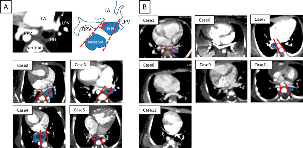 胸部CT画像における滑脱した胃と肺静脈との位置関係の相違を,肺静脈圧排例と非圧排例で観察し比較した.13例全例において肺静脈は共通肺静脈腔を形成し心房に接続していた.肺静脈圧排群(症例2, 3, 4, 5)では,①滑脱した胃の先進部が共通肺静脈腔と同じ高さに達している,②滑脱した胃は必ず心房椎体間に位置し,肺静脈を後方から圧排している,といった特徴を有していた.なお,下行大動脈は肺静脈圧排に関与していなかった.一方で肺静脈非圧排群では,①滑脱した胃の先進部が共通肺静脈腔の高さに達していない例(症例6, 8, 9, 12)と,②滑脱した胃の先進部が共通肺静脈腔の高さに達していても,共通肺静脈腔よりも末梢に位置している例(症例1, 7, 11)があった.肺静脈圧排群と非圧排群の特徴は,椎体の両縁から左右の肺静脈開口部へそれぞれ線を引き,その線の間に滑脱した胃が含まれるかどうかでより明確に判断できた(Fig. 4A).肺静脈圧排群では滑脱した胃は同線の間に位置した(Fig. 4A).一方で非圧排群では,滑脱した胃は同線外側に位置するか,肺静脈心房開口部とは同じCT断面で観察されず肺静脈開口部よりも腹側に位置していた(Fig. 4B).