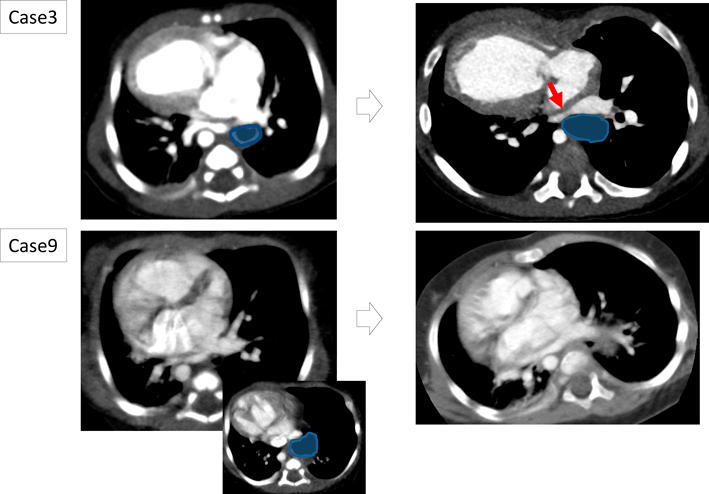 また,肺静脈圧排群のうち症例3, 4, 非圧排群のうち症例8, 9, 12では経時的な漏斗胸の増悪を認めた.肺静脈圧迫群である症例3, 4は漏斗胸の進行に伴い肺静脈圧排が持続していたが,非圧排群である症例8, 9, 12は漏斗胸の増悪にもかかわらず肺静脈圧排の出現はなかった.Fig. 5に肺静脈圧排群である症例3,非圧排群である症例9の経時的変化を示す.漏斗胸は滑脱した胃による肺静脈圧排の増幅要因として影響していた.