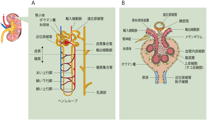 腎臓には水・電解質・老廃物の排泄調整,酸塩基平衡調整,血行動態を調整するレニン,アンジオテンシンII,プロスタグランジンの分泌や制御,赤血球産生にかかわるエリスロポエチンやカルシウム・リン代謝にかかわるビタミンD・副甲状腺ホルモンの分泌調整など様々な機能があるが,本稿では利尿薬に関係する内容についてのみ記載する.腎臓で濾過される血液は心拍出量の20~25%であり,濾過されたあとは原尿となる.ネフロンは腎小体と尿細管で構成される尿生成に関する最小の機能単位である(Fig. 1).腎小体は糸球体とボウマン嚢で形成され,尿細管は近位尿細管・ヘンレループ・遠位尿細管・集合管で構成される.ネフロンは腎臓1個に約100万個,両腎で約200万個存在するとされているが,実際に機能しているのはその10%ほどである7–9).