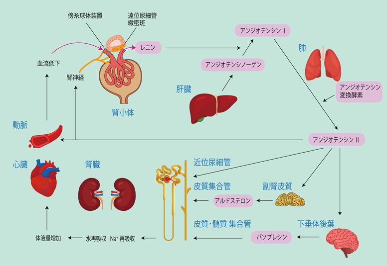 傍糸球体装置からのレニン分泌を促進する要因としては様々な因子が挙げられる.①輸入細動脈に流入する血液量が減少すること,②遠位尿細管における尿中Cl−濃度の低下が緻密斑を介して傍糸球体装置を刺激すること,③血圧低下による腎神経を介した交感神経刺激などが主なものである.