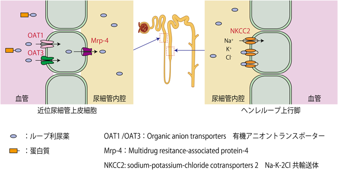 ループ利尿薬は血液中では蛋白質と結合して存在し,近位尿細管にあるOAT1/OAT3によって尿細管細胞内に取り込まれ,尿細管腔側のMrp-4によって尿細管腔内に分泌される.ループ利尿薬はヘンレループ尿細管上皮の管腔側に存在するNKCC2に細胞外から結合して電解質の細胞内への輸送を阻害する.