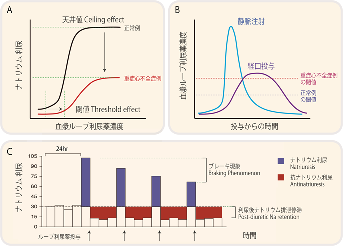 A:正常対象例と重症心不全症例における血漿ループ利尿薬濃度とナトリウム利尿効果との関係を示す.重症心不全症例では効果が得られ始めるループ利尿薬の閾値を上昇させ,効果の上限であるナトリウム利尿の天井値が低下する.B:静脈注射または経口投与における血漿ループ利尿薬濃度と投与からの時間との関係を示す.ナトリウム利尿の閾値(破線)は重症心不全症例では正常対照例より高い.ナトリウム利尿はこの閾値以上の時間における関数(AUC; area under the curve)である.このため,正常対照例では経口投与と静脈注射では同程度の効果が認められるが,重症心不全症例では経口投与では効果が非常に小さく,静脈注射によってある程度の効果が得られることとなる場合が多い.C:ループ利尿薬の反復投与によるナトリウム利尿効果を6時間ブロックで示す.ループ利尿薬投与後のナトリウム利尿の後にナトリウム排泄停滞が生じ,利尿薬の効果においてもブレーキ現象が認められる.Figure modified from Ellison DH, et al. [ref. 29] with permission.