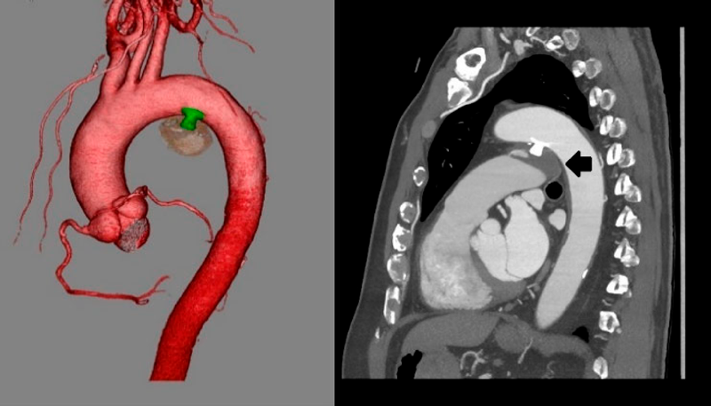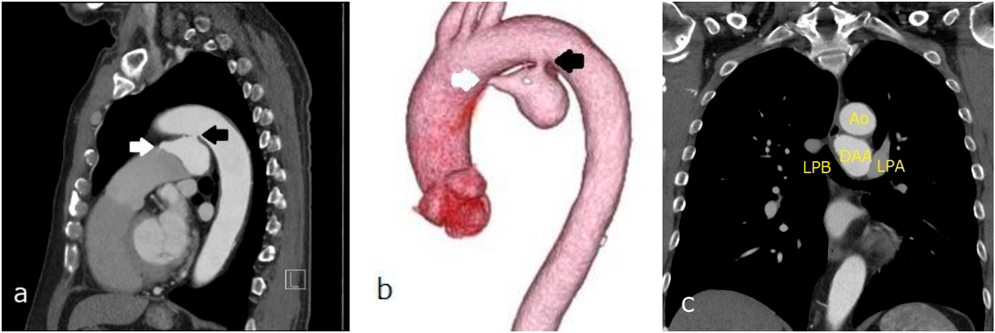 大動脈弓小彎側に入口部(径5.6 mm)をもつ最大径39 mの嚢状に拡大したDAAを認め,肺動脈側に出口部(2.2 mm)をもつ.大動脈解離なし.DAAは左主気管支と接触しているが圧排なし(Fig. 2).