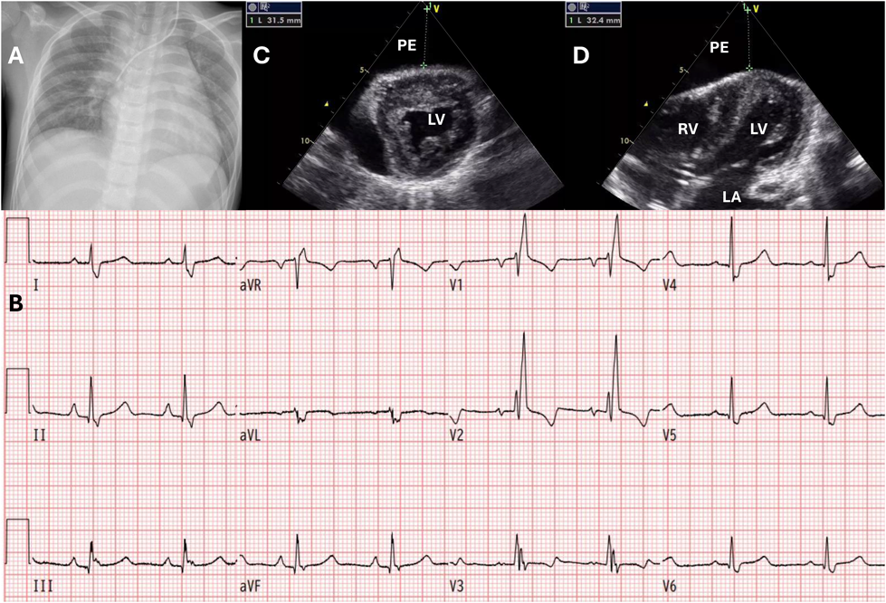 入院時の血液検査で代謝性アシドーシスを認めた.D-dimerは10.2 µg/mLと高値,CK-MBは3.0 ng/dLと軽度高値,トロポニンIは299 pg/mLで高値,BNPは374 pg/mLに上昇していた.ASO,リウマチ因子,甲状腺刺激ホルモンに異常を認めなかった.感染症検査として,多項目ポリメラーゼ連鎖反応(polymerase chain reaction: PCR)パネル検査を行ったがいずれも陰性だった.βDグルカンや結核菌特異的インターフェロンγ検査は陰性,その他提出していた血液学的検査で,CoxA2-IgG抗体と,CoxA9-IgG抗体が32倍(NT法)と後日判明した.胸部X線写真では心胸郭比(cardiothoracic ratio: CTR)59%と心拡大および肺うっ血像を認めた(Fig. 1A).心電図検査では,VSD術後から認めていた完全右脚ブロック波形を認め,全体的にやや低電位だったが,過去の心電図と比較してST部分の変化は認めなかった(Fig. 1B).心臓超音波検査では心臓前面に4 cm程度の心嚢水貯留を認め,右室は圧排されていた(Fig. 1C, D).